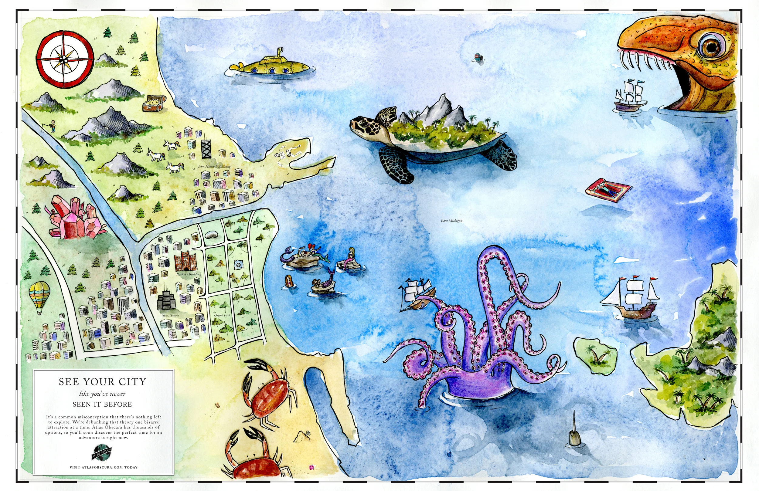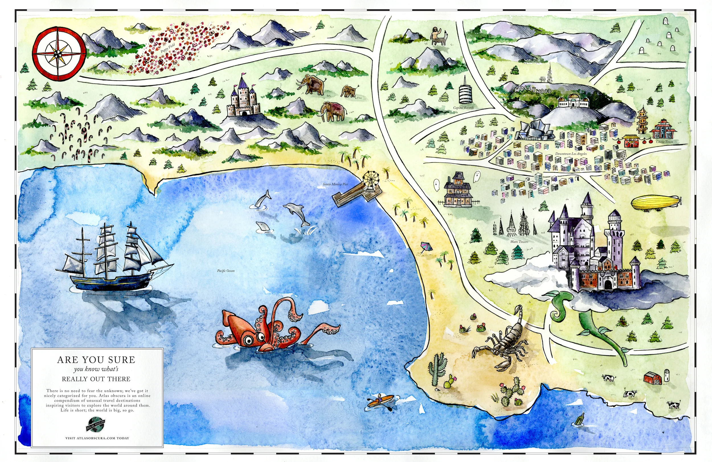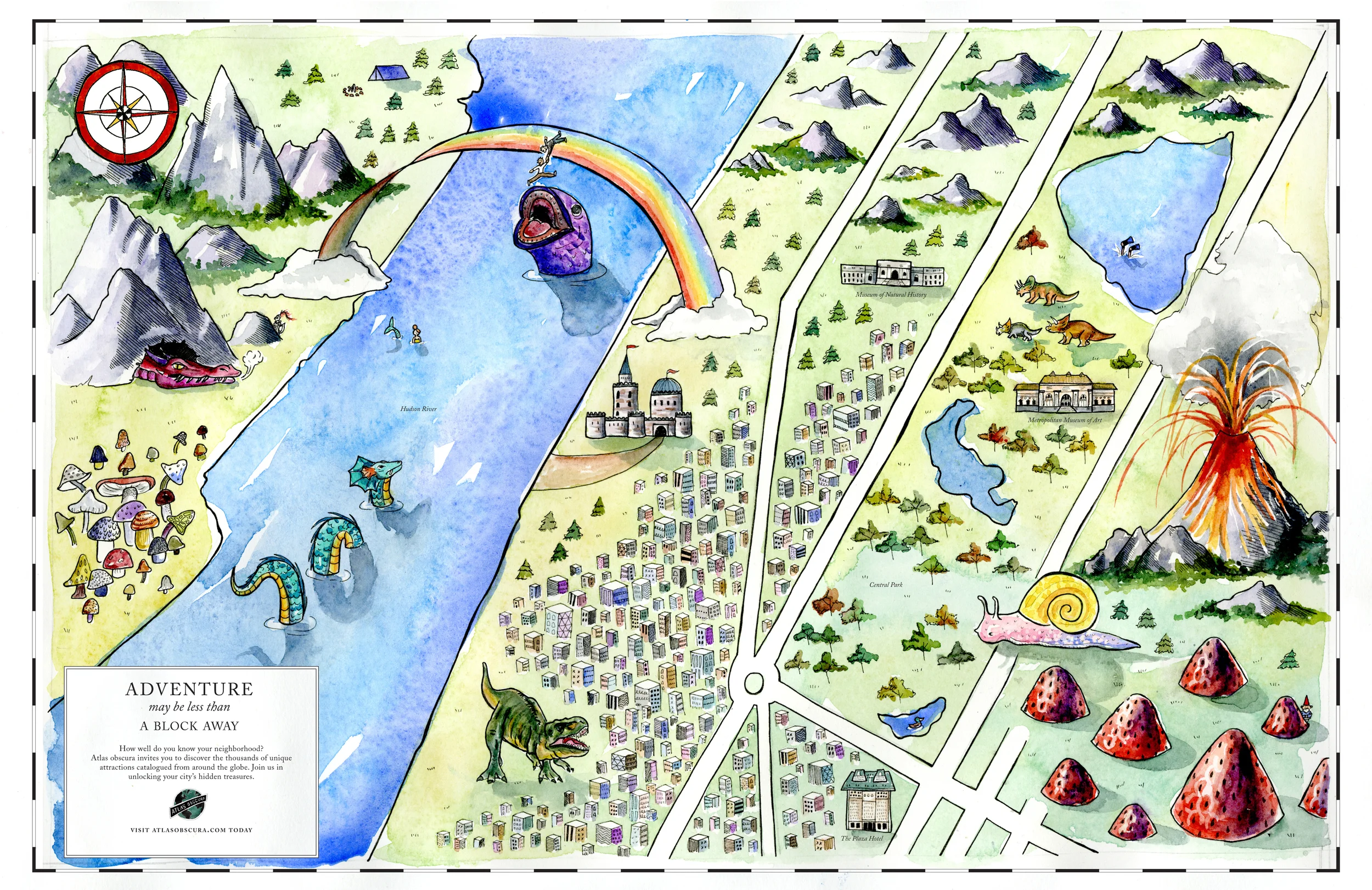 Atlas Obscura is a website that serves as an informative catalogue of exotic and unusual attractions found around the globe. Places are provided by users as they participated in the collaboration of the website by sharing their unique experiences or stumble upons. Each place is geo-mapped so other users can browse through and plan a trip to visit themselves. Each ad is an illustrated map of a well-known American city altered to feature fantastical creatures and landscapes. This exaggeration is meant to display to viewers that they don't know their city as well as they think, and there remains hidden gems worth discovering.