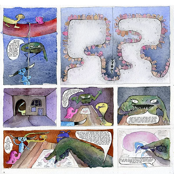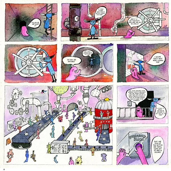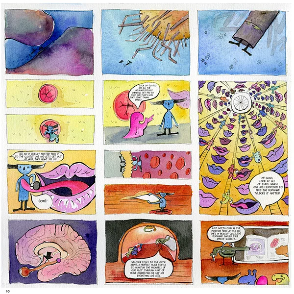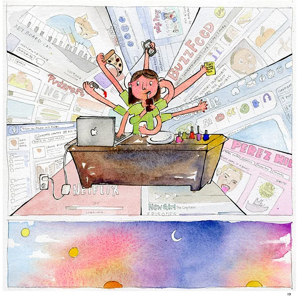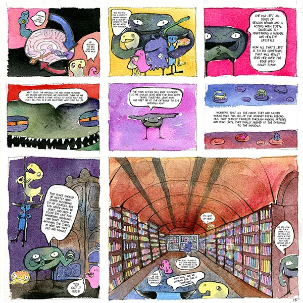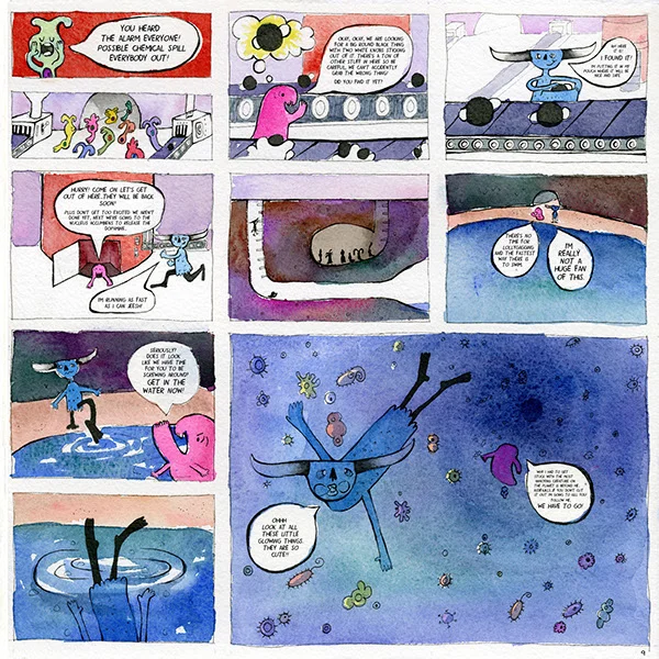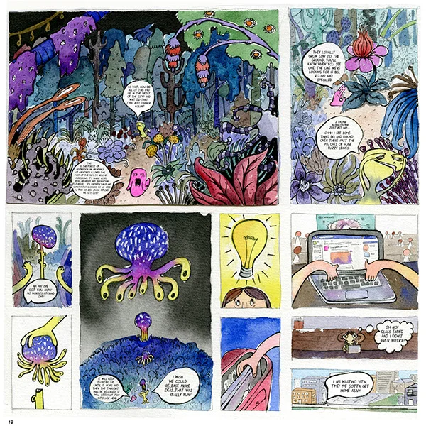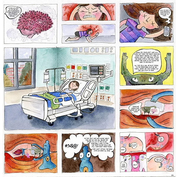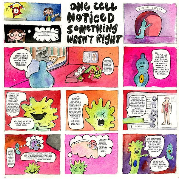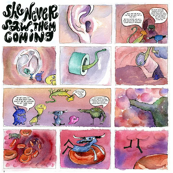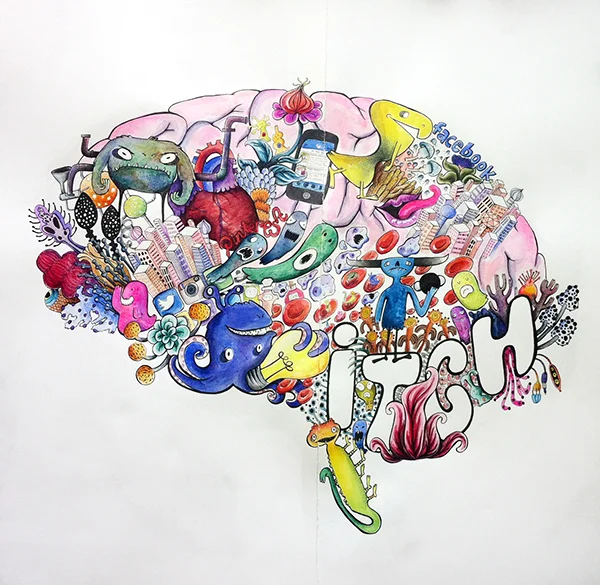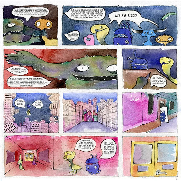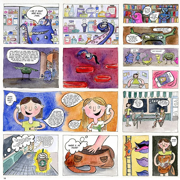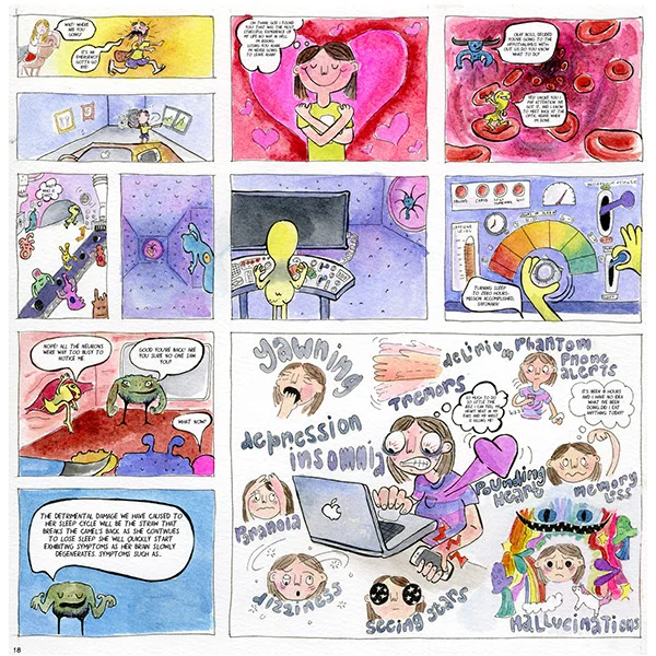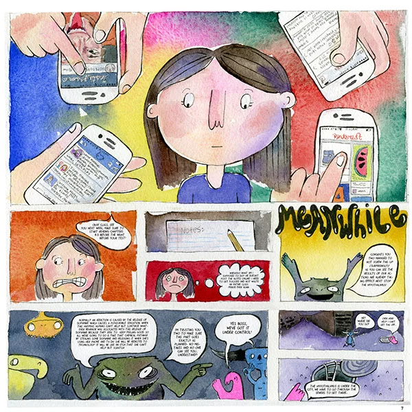 Comic book created for a watercolor illustration class. What happens when a team of creatures invade the brain and cause the subject to become addicted to technology; the book explains the neuro-chemical pathways of addiction with a humorous approach. Completed as part of Comic Book Illustration.