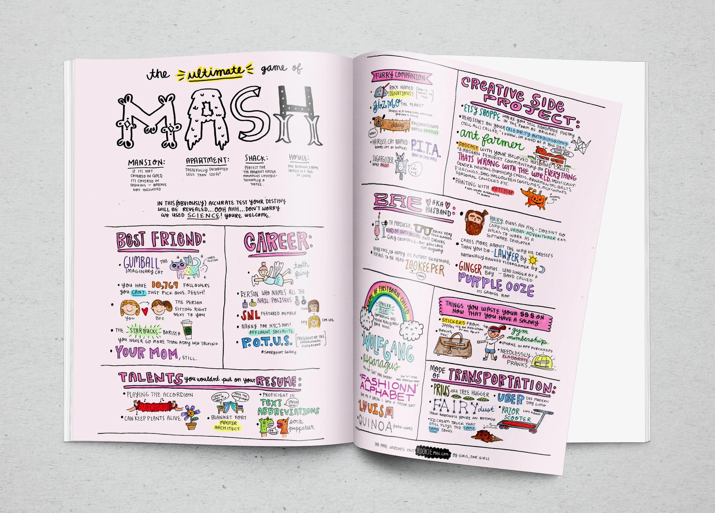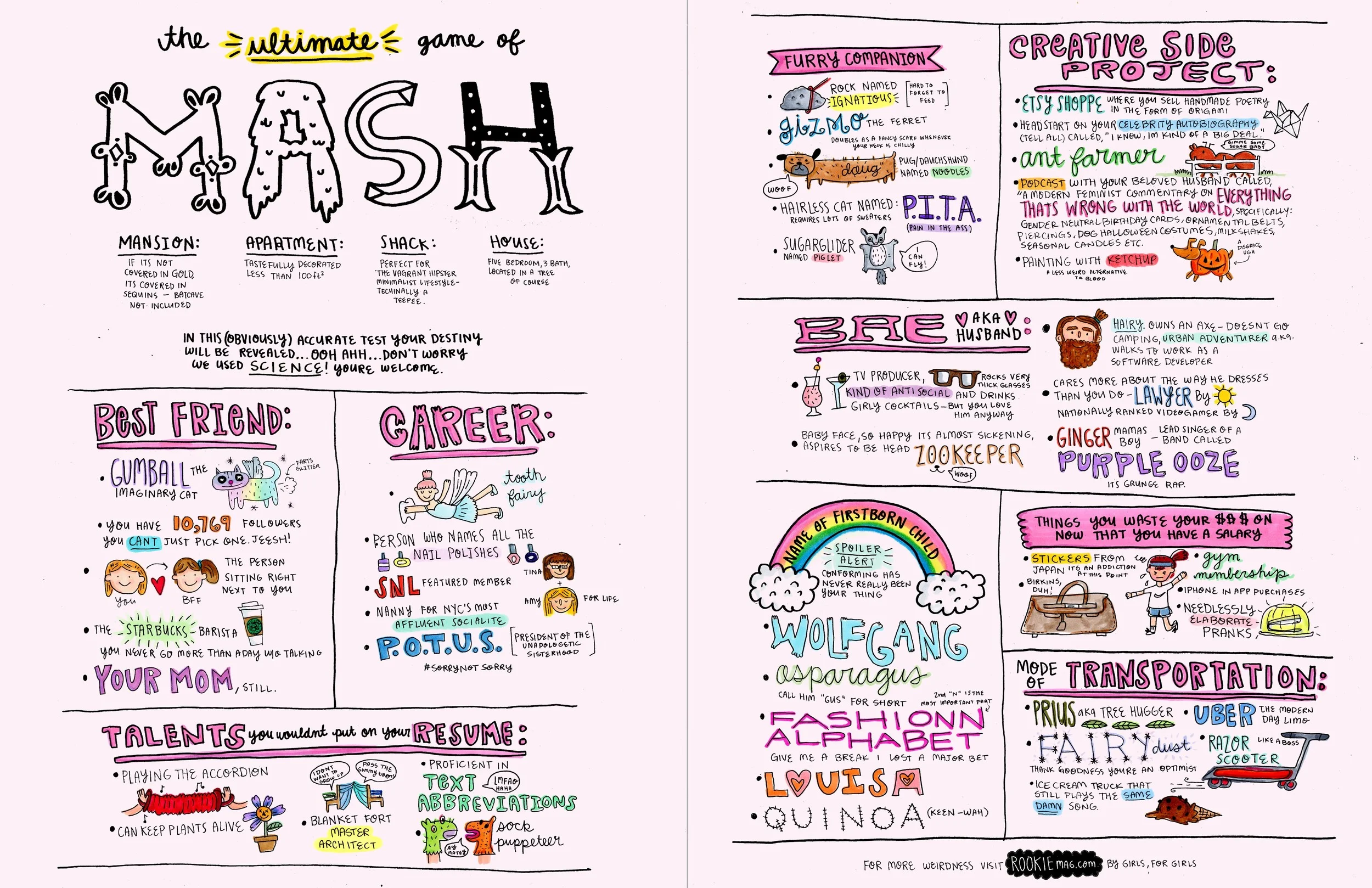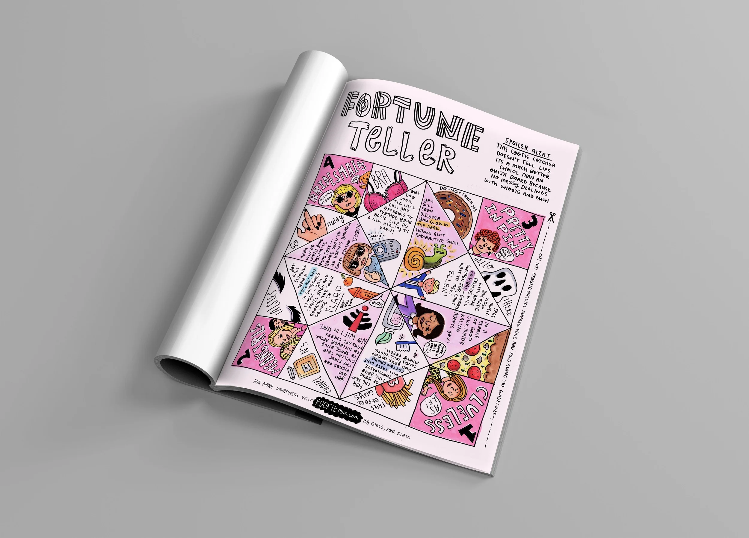 Rookie is an online magazine for girls. It's unique from other publications in that the editors and contributors aren't adults, they are teenagers themselves. Rookie publishes staff content as well as encourages online submissions (art, poetry, articles, and short stories etc.) from the public. The concept behind the campaign was to find a unique way to capture the attention of the target audience, girls ages 13-18, which is to give viewers something to play with. In utilizing games girls would be familiar with/are commonly seen in other teen publications, while giving them a totally different spin, the core qualities of the publication are promoted: female empowerment, open-mindedness, individuality, and authenticity.